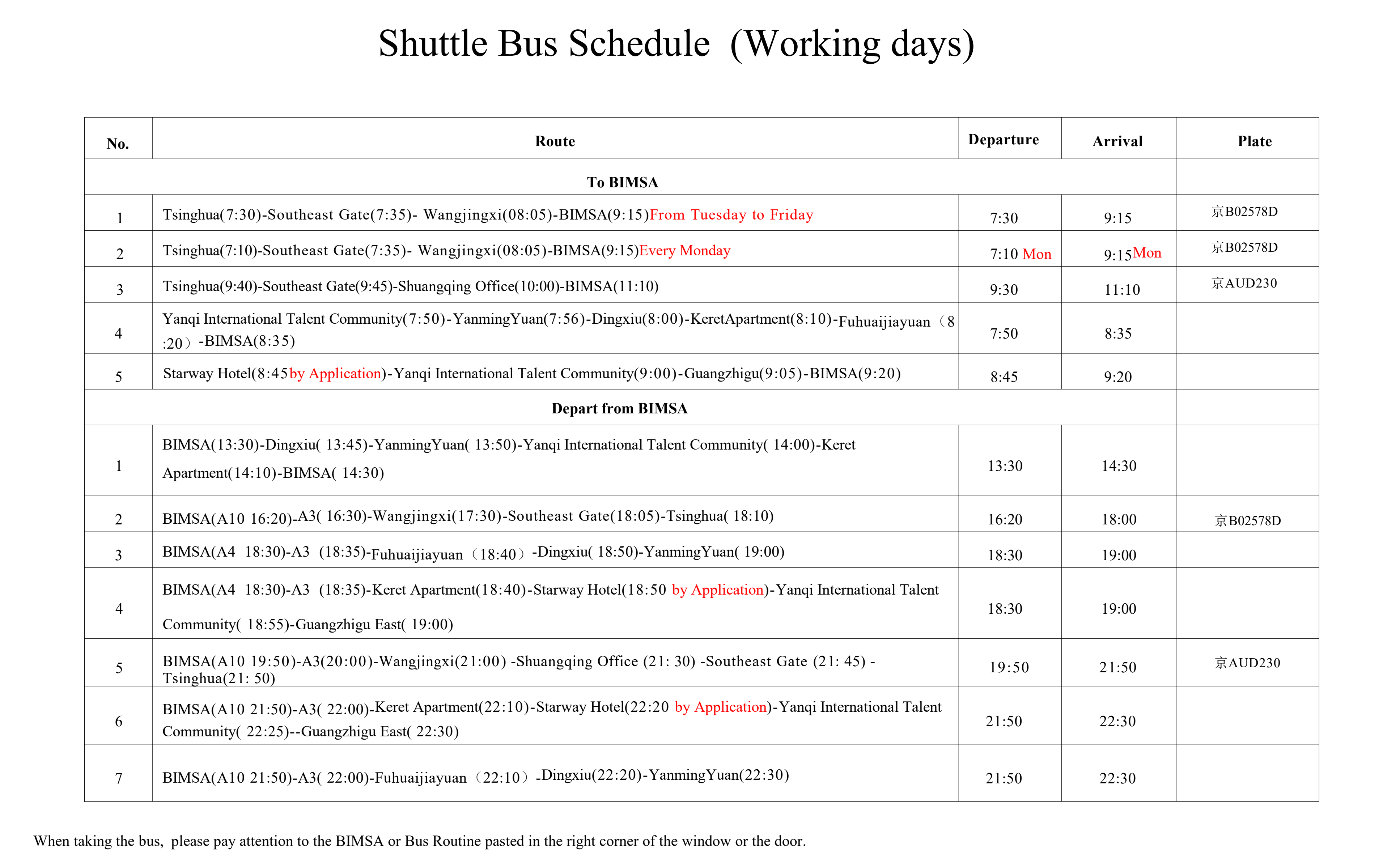 2. The Huairou-Tsinghua shuttle bus runs weekly on demand. Every Wednesday, the "Needs Survey on 'Huairou-Tsinghua' Shuttle Bus" for the following week will be posted in the "BIMSA 全体" WeChat group. Please fill in the form (name, boarding location, and number of people). The deadline for submissions is 5:00 PM every Friday.